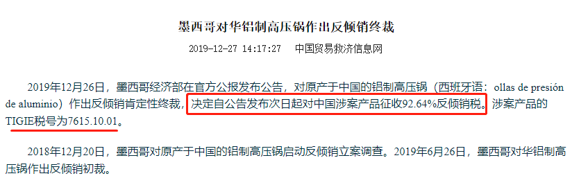 據外媒報道,12月27日墨西哥經濟部宣布,將對原產于中國的鋁箔紙卷以及鋁制高壓鍋產品加收費用,費率最高達92.64%,原因是中國出口到當地的鋁制壓力鍋價格低于上限設定的每公斤3.4817美元。