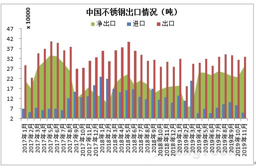 前期因印尼進(jìn)料加工貿(mào)易產(chǎn)品增多,國內(nèi)不銹鋼進(jìn)口量增加,而11月印尼來、進(jìn)料加工量僅0.17萬噸(占印尼進(jìn)口料的34%),加上反傾銷涉案產(chǎn)品進(jìn)口持續(xù)維持低位,導(dǎo)致11月國內(nèi)不銹鋼進(jìn)口降至年內(nèi)低點,與4月(反傾銷初裁發(fā)布)進(jìn)口量相當(dāng)。青山印度不銹鋼冷軋項目于11月下旬因沒有環(huán)境許可證(EC)而暫停,印尼國內(nèi)消化能力有限,所以12月可能會有大量的印尼資源出口至中國。據(jù)業(yè)內(nèi)人士分析,12月印尼冷軋進(jìn)口量預(yù)計可至3萬噸,加上目前方坯也不再征收反傾銷稅后,12月其方坯的進(jìn)口量也將增多。受國外反傾銷影響,今年以來國內(nèi)不銹鋼出口同比下降,但出口意大利的累計量同比增加20%(累計出口量僅25.8萬噸)。因國外圣誕節(jié)備貨刺激消費(fèi),11月國內(nèi)不銹鋼出口多小增,目前處于年內(nèi)高位。(出口韓國的量已連續(xù)3個月增加,創(chuàng)年內(nèi)新高至5.6萬噸)進(jìn)口降至年內(nèi)低點 出口增至年內(nèi)高點11月中國進(jìn)口不銹鋼5.05萬噸,環(huán)比減少42.4%,同比減少60.4%;出口不銹鋼32.89萬噸,環(huán)比增加4.5%,同比增加7.9%。2019年1-11月,中國進(jìn)口不銹鋼累計102.3萬噸,同比減少73.1萬噸,減幅41.7%;出口不銹鋼累計335萬噸,同比減少36.3萬噸,減幅9.8%。反傾銷涉案產(chǎn)品進(jìn)口持續(xù)低位11月,從印度尼西亞進(jìn)口涉案產(chǎn)品約0.28萬噸(其中進(jìn)、來料加工的量約0.17萬噸)(環(huán)比下降90.6%),韓國0.68萬噸(環(huán)比下降58.7%),歐盟0.17萬噸(環(huán)比增加83.7%),日本0.24萬噸(環(huán)比增加101.3%)。印尼資源回國量再降至0.5萬噸,年內(nèi)低點11月從印尼進(jìn)口的不銹鋼寬幅板卷及半制成品的量再次下降,已至0.5萬噸(其中來、進(jìn)料加工的量約0.17萬噸),環(huán)比減少2.9萬噸,減幅85.7%;同比減少5.3萬噸,減幅91.6%。其中:寬幅熱卷有0.24萬噸,環(huán)比減少90.2%,同比減少94%;寬幅冷軋有0.2萬噸,環(huán)比減少47.2%,同比減少75.4%;矩形截面半制成品(俗稱板坯)有0.05萬噸,環(huán)比減少91.9%,同比減少95%;正方形截面半制成品(俗稱方坯)的量為0。
