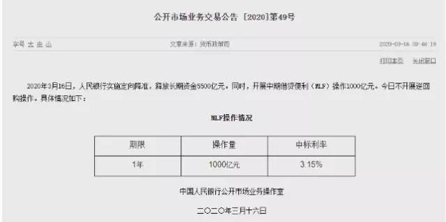 央行公告顯示,3月16日央行實(shí)施定向降準(zhǔn),釋放長(zhǎng)期資金5500億元。同時(shí),開(kāi)展中期借貸便利(MLF)操作1000億元。今日不開(kāi)展逆回購(gòu)操作。