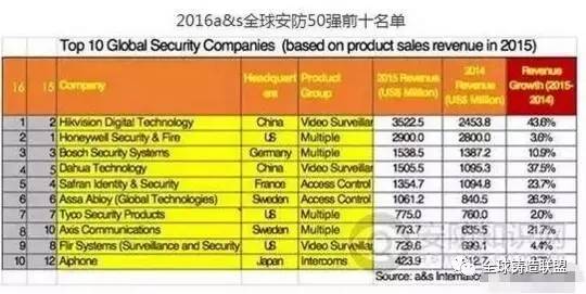 從圖中我們可以看到,不僅是海康拿下了全球第一,還有一家中國公司大華科技也拿下了全球第四,更為重要的是,前十名的營收和市場份額增速,海康第一48.8%,大華第二37.5%,遠遠超過歐美公司。