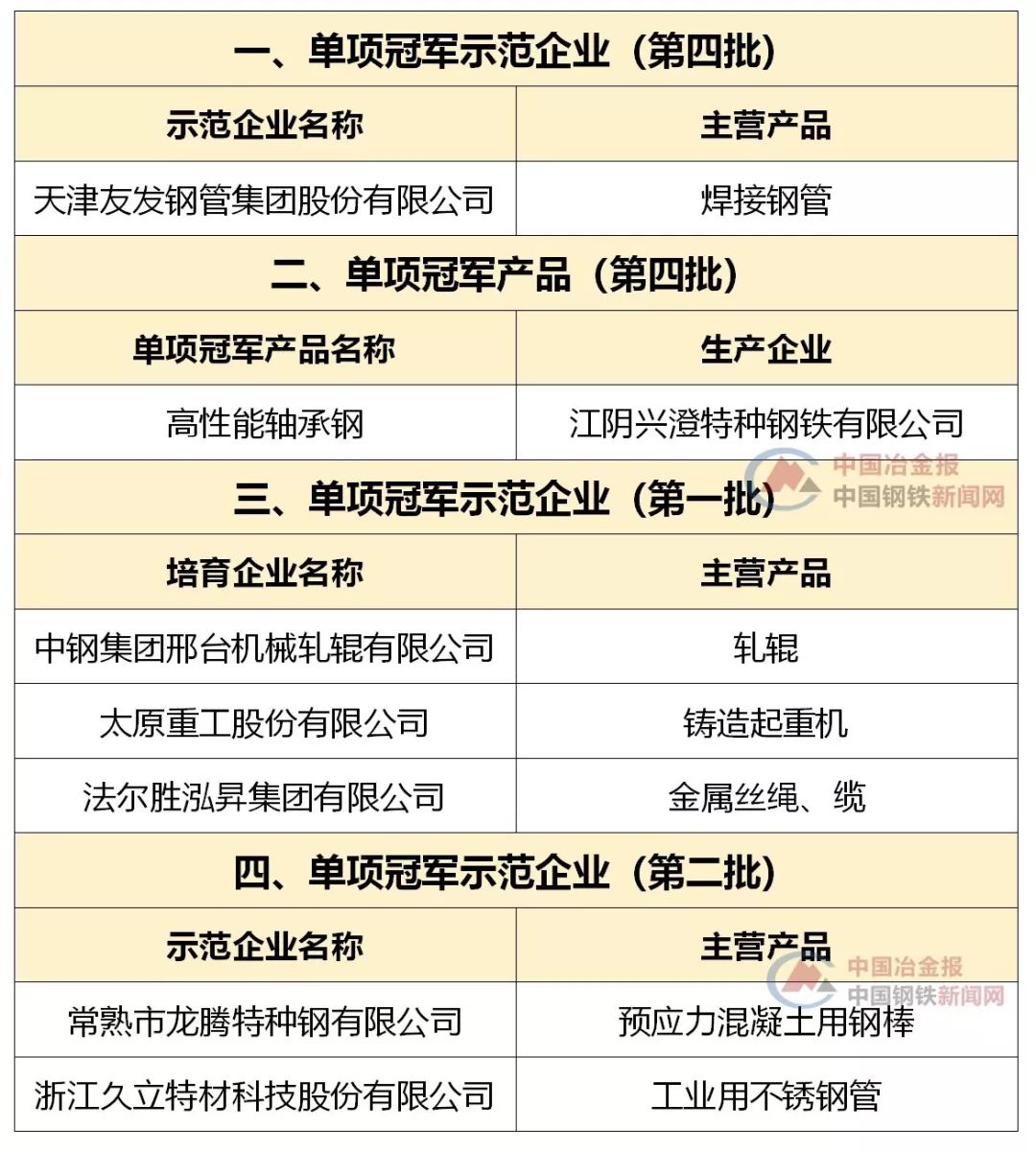 從《公示》中獲悉,此次制造業(yè)單項冠軍名單包括單項冠軍示范企業(yè)和單項冠軍產(chǎn)品兩個類別,其中涉及鋼鐵行業(yè)的單項冠軍整理如下: