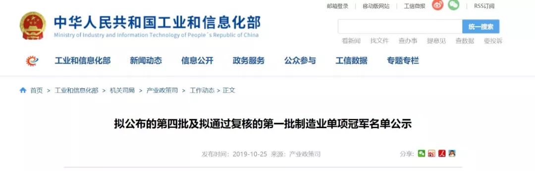 10月25日,工信部發(fā)布了《擬公布的第四批及擬通過復核的第一批制造業(yè)單項冠軍名單公示》(以下簡稱“《公示》”),《公示》稱,根據(jù)《工業(yè)和信息化部辦公廳 中國工業(yè)經(jīng)濟聯(lián)合會關于組織推薦第四批制造業(yè)單項冠軍和復核第一批制造業(yè)單項冠軍的通知》(工信廳聯(lián)產(chǎn)業(yè)函〔2019〕78號)要求,現(xiàn)將擬公布的第四批及擬通過復核的第一批制造業(yè)單項冠軍名單予以公示。公示時間為2019年10月25日-10月31日。