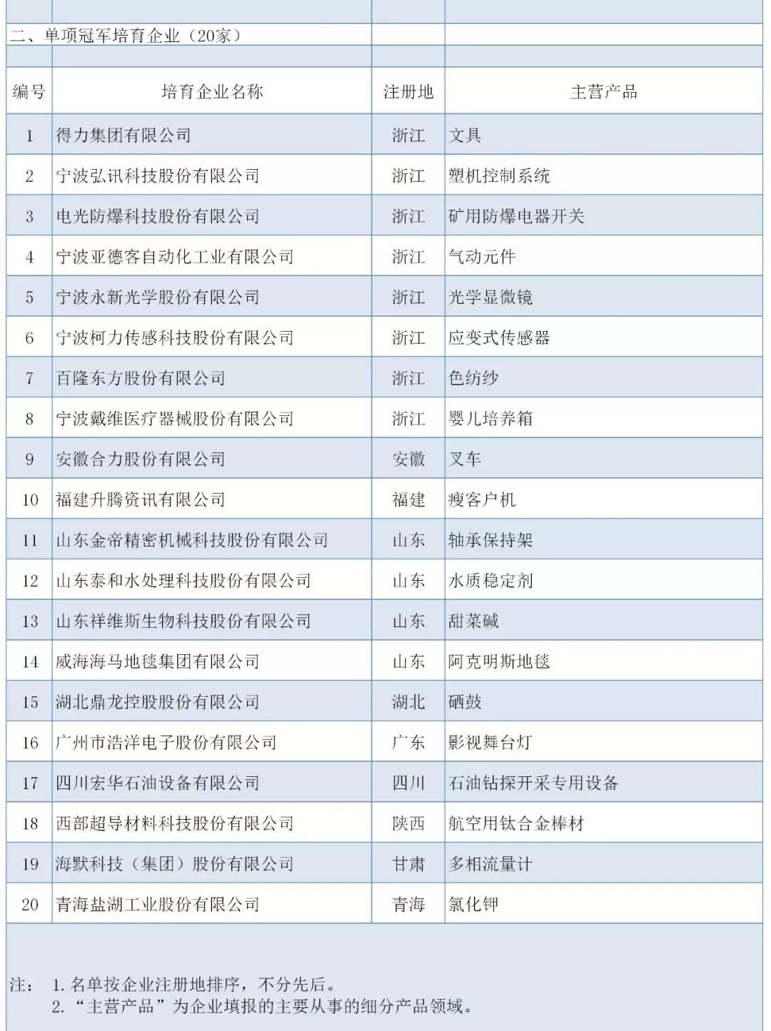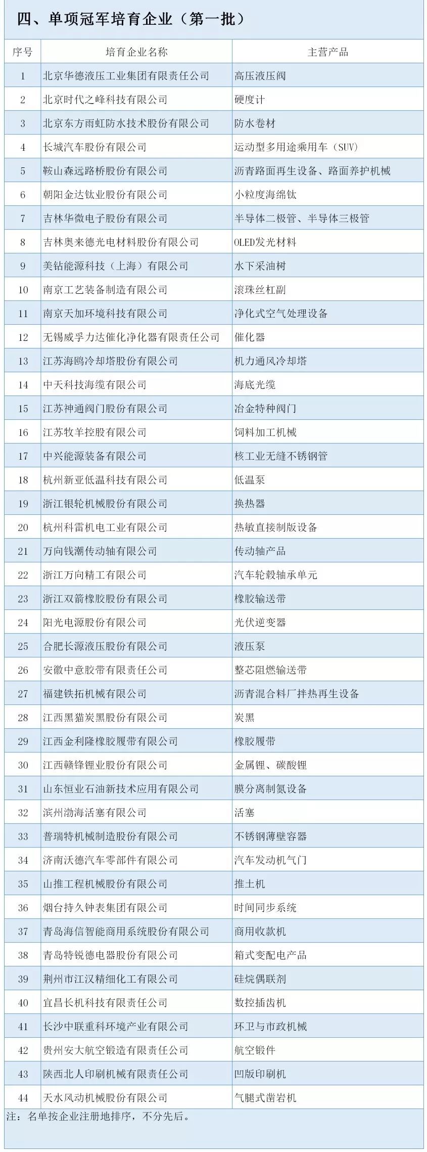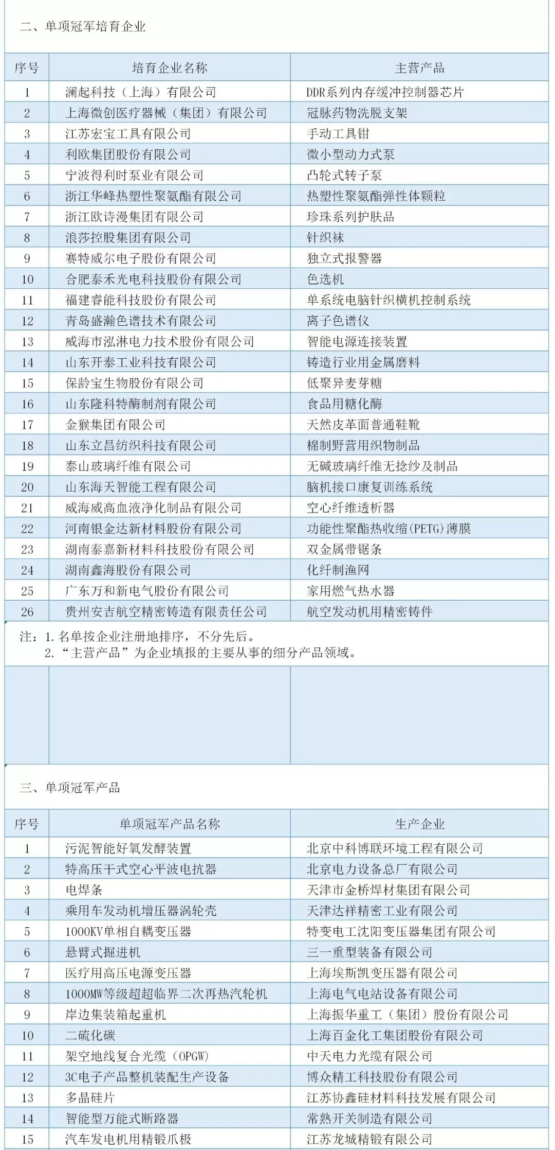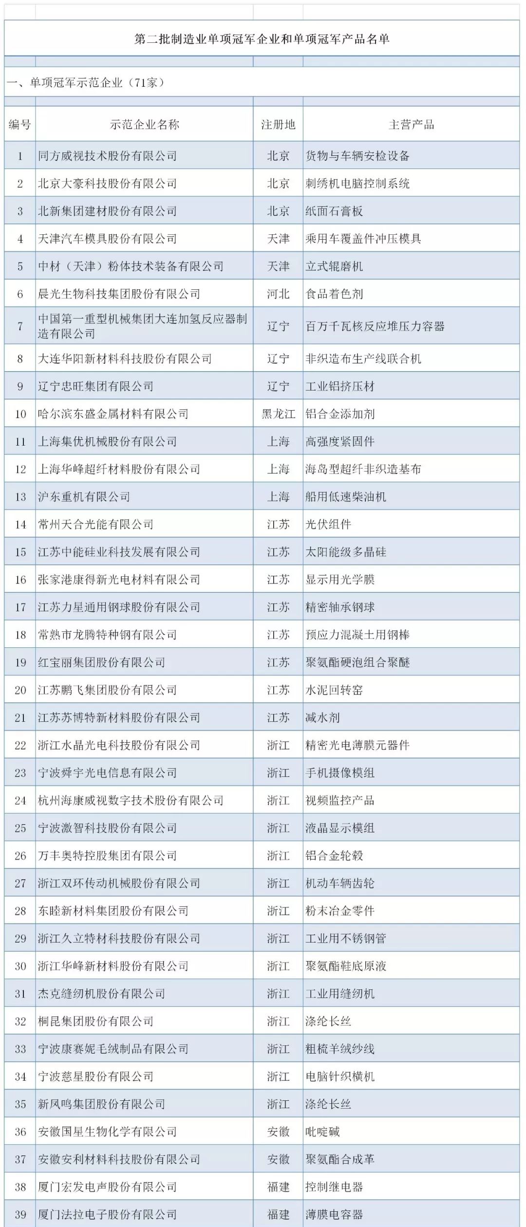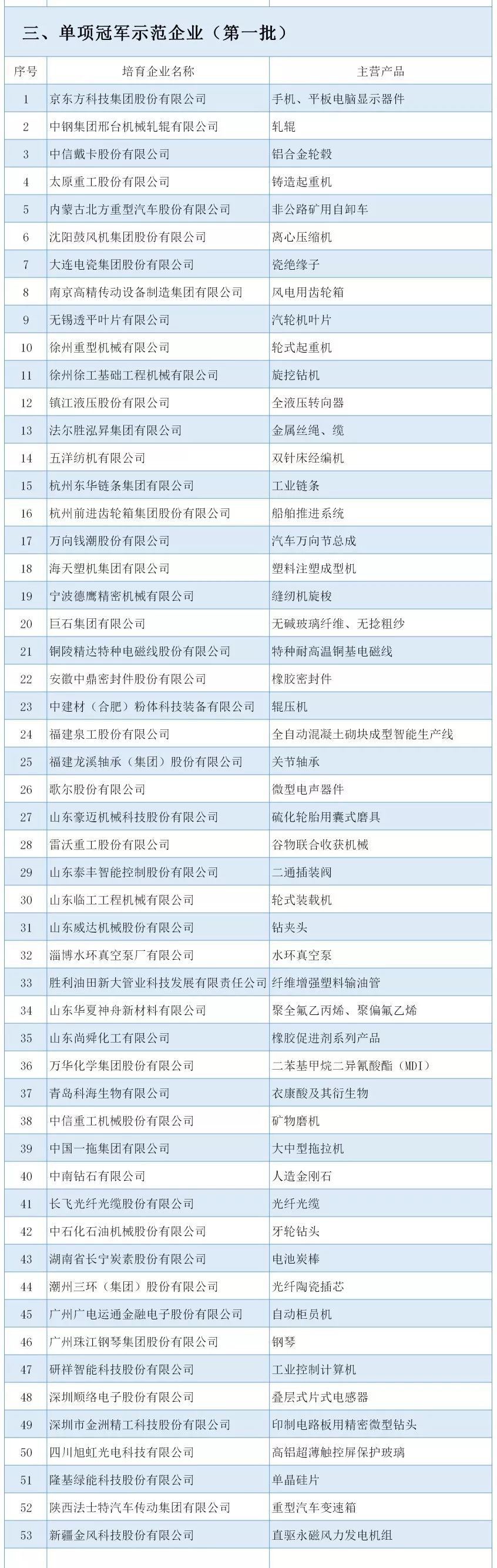 附擬公布的第四批及擬通過復核的第一批制造業(yè)單項冠軍完整名單,以及第二、第三批制造業(yè)單項冠軍完整名單: