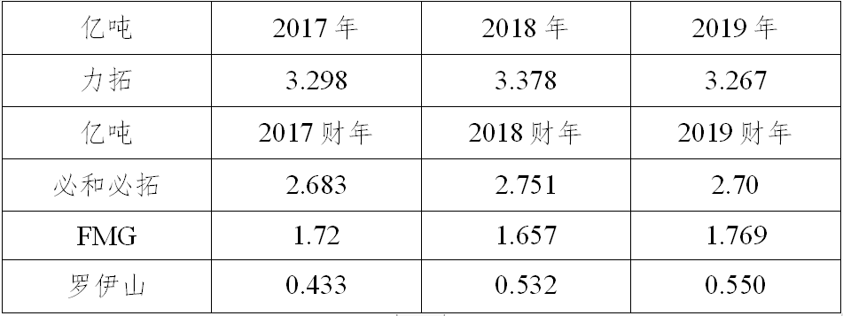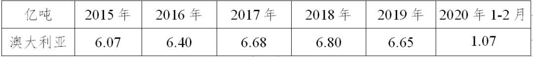 2019年,我國(guó)鐵礦石原礦產(chǎn)量8.44億噸,折合鐵精粉26567萬(wàn)噸。據(jù)國(guó)家統(tǒng)計(jì)局公布的數(shù)據(jù), 2020年1-2月,我國(guó)鐵礦石原礦產(chǎn)量同比下降4.6%,產(chǎn)量下降主要受到疫情的影響。伴隨著國(guó)內(nèi)疫情形勢(shì)向好、各地生產(chǎn)活動(dòng)復(fù)蘇。據(jù)中國(guó)冶金礦山企業(yè)協(xié)會(huì)預(yù)測(cè),二季度,國(guó)產(chǎn)鐵精粉產(chǎn)量將環(huán)比回升,預(yù)計(jì)2020年產(chǎn)量與2019年基本持平。2019年,中國(guó)自澳大利亞進(jìn)口鐵礦石6.65億噸,同比減少1500萬(wàn)噸,占全年進(jìn)口總量的62.21%。由于颶風(fēng)天氣,2019年,澳大利亞四大礦山的產(chǎn)量受到不同程度的影響。季報(bào)顯示,2019年,力拓皮爾巴拉地區(qū)鐵礦石產(chǎn)量3.267億噸,同比減少1110萬(wàn)噸。2019財(cái)年,必和必拓西澳鐵礦產(chǎn)量2.70億噸,同比減少510萬(wàn)噸;FMG鐵礦石產(chǎn)量1.769億噸,同比增加1120萬(wàn)噸;羅伊山鐵礦石產(chǎn)量5500萬(wàn)噸,同比增加180萬(wàn)噸。表1:中國(guó)進(jìn)口澳大利亞鐵礦石情況(海關(guān))