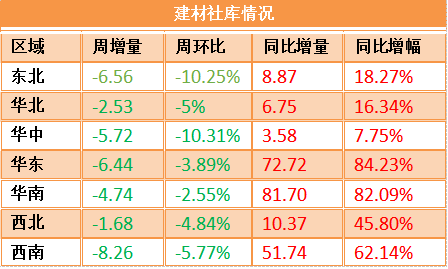 建材方面,華中降庫加快,本周環比下降10.31%,較去年同期高出7.75%。華北地區降庫略有放緩,周環比下降5%,較去年同期高出16.34%。華東和華南地區庫存壓力依然較大,分別高出去年同期84.23%、82.09%。