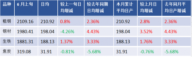 據中鋼協數據,6月上旬,重點鋼企共生產粗鋼2109.16萬噸、生鐵1881.31萬噸、鋼材1980.41萬噸、焦炭319.08萬噸。粗鋼、鋼材、生鐵日均產量同比去年均保持增長,分別增加2.36%、4.43%、3.33%。環比來看,粗鋼產量較5月下旬繼續增加0.8%。增產遇上梅雨季,去庫存壓力仍大。值得關注的是,焦炭因山東“以煤定產”等限產政策,6月產量環比同比均出現下降。原料端偏強運行成為目前鋼價的重要支撐。