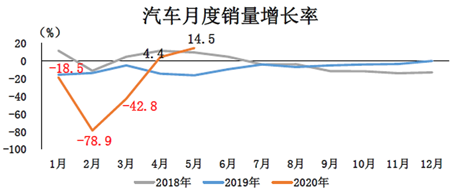 疫情過后制造業中的汽車產業恢復較快,5月產銷均呈現正增長。5月汽車產銷分別達到218.7萬輛和219.4萬輛,環比增長4.0%和5.9%,同比增長18.2%和14.5%,增速高于上月15.9個百分點和10.1個百分點。
