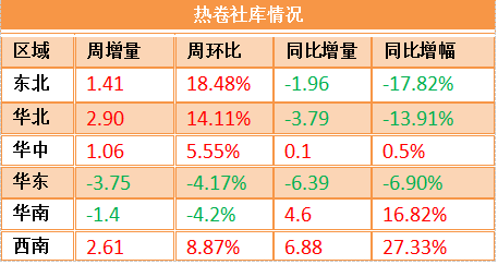 熱卷累庫(kù)分化,整體庫(kù)存壓力不大。其中華東和華南地區(qū)本周處于降庫(kù)階段,尤其是華東地區(qū)熱卷總庫(kù)存量已經(jīng)由上周同比增加,轉(zhuǎn)變?yōu)楸局艿耐认陆?.9%。華北地區(qū)雖周環(huán)比增庫(kù),但總庫(kù)存較去年同期下降13.91%。目前西南地區(qū)熱卷庫(kù)存壓力最大,較去年同期增加27.33%。
