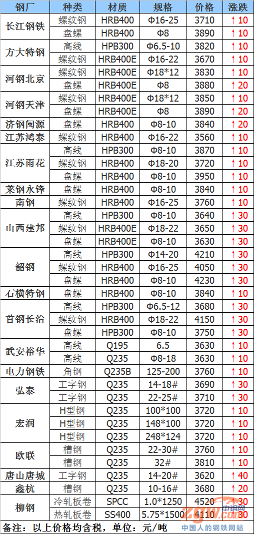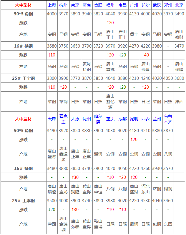 數據監測,昨日共26家鋼廠調價,其中漲幅最高為唐城工字鋼,調價幅度40元/噸,具體調價明細如下:
