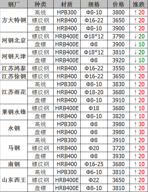 螺紋鋼24個市場中4個市場上漲10-20,3個市場下跌10-20,螺紋鋼20mmHRB400E平均價格3751元/噸,較上個交易日下調1元/噸;