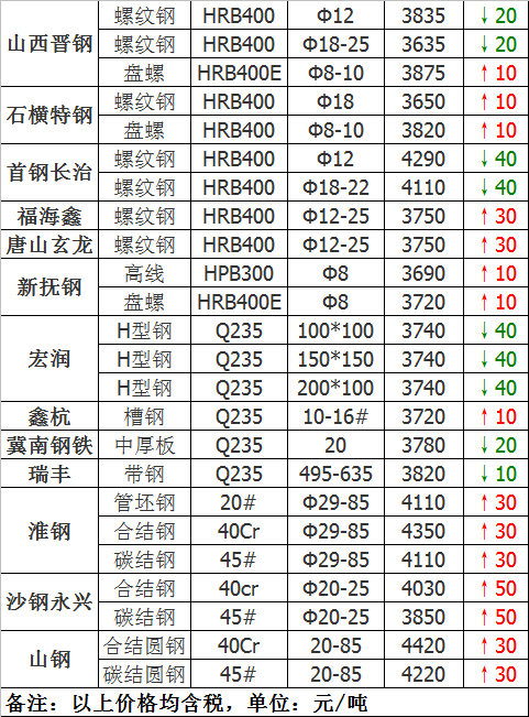 另外,據中鋼網數據監測,今日統計的39家鋼廠調價中,漲幅最高為沙鋼工業線材,調價幅度130元/噸,跌幅最大為宏潤H型鋼,調價幅度40元/噸,具體請看推文第三條鋼廠調價;