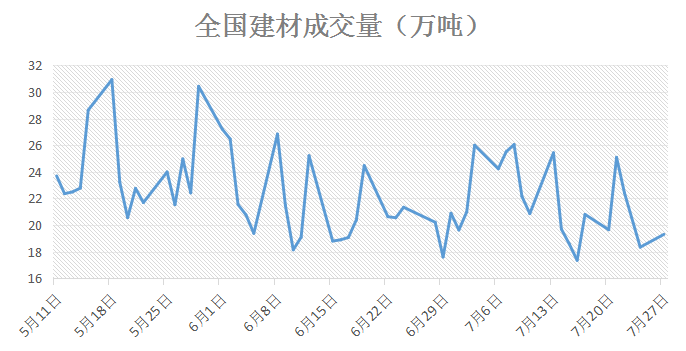 隨著價格的回落,且臨近月底,市場觀望情緒回升,建材成交量低于20萬噸,持續低位徘徊,南方部分地區仍受洪澇影響,下游商家采購積極性不高,需求的釋放仍受影響。