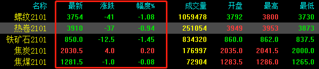 期螺下跌41收?qǐng)?bào)3754,期卷下跌37收?qǐng)?bào)3910,鐵礦石下跌12.5收?qǐng)?bào)850,焦炭上漲4收?qǐng)?bào)2030.5,焦煤下跌1收?qǐng)?bào)1281.5。