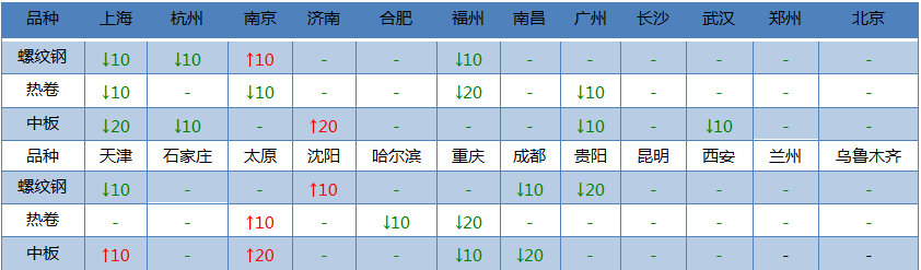 今日現(xiàn)貨受到期貨大跌影響,成交有所回落,唐山帶鋼一枝獨(dú)秀報(bào)價(jià)上調(diào)。全國(guó)多數(shù)城市三大品種穩(wěn)中有跌,但在高預(yù)期支撐下,跌幅有限,10-30。