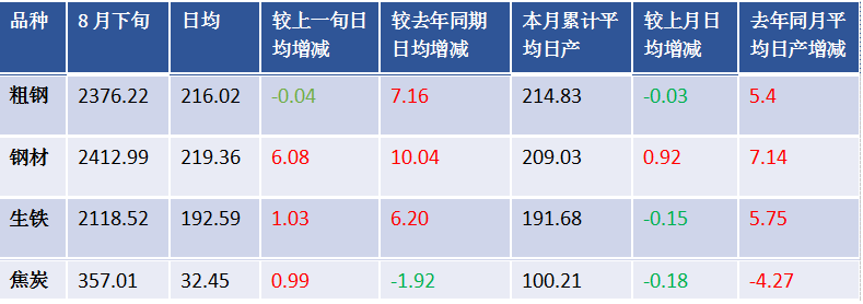 中鋼協(xié)數(shù)據(jù)顯示,8月下旬,重點(diǎn)統(tǒng)計(jì)鋼企粗鋼2376.22萬(wàn)噸、生鐵2118.52萬(wàn)噸、鋼材2412.99萬(wàn)噸、焦炭357.01萬(wàn)噸。本旬日均產(chǎn)量,除粗鋼小幅回落外,均呈現(xiàn)增產(chǎn)態(tài)勢(shì),且鋼材增產(chǎn)幅度達(dá)到6.08%。粗鋼、鋼材、生鐵產(chǎn)量均高于去年同期水平。