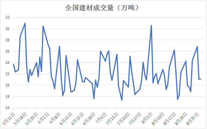 本周全國(guó)建材成交量整體較上周回升,最高接近27萬(wàn)噸。但仍然低于5月旺季成交水平,說(shuō)明需求并未充分釋放,9月鋼價(jià)波動(dòng)的核心將是需求能否兌現(xiàn)達(dá)到預(yù)期,持續(xù)關(guān)注成交量變動(dòng)。