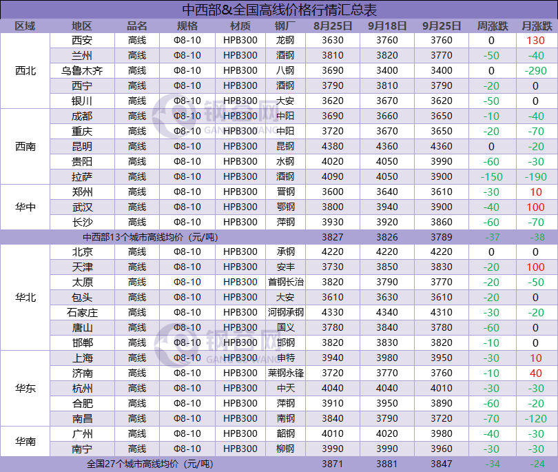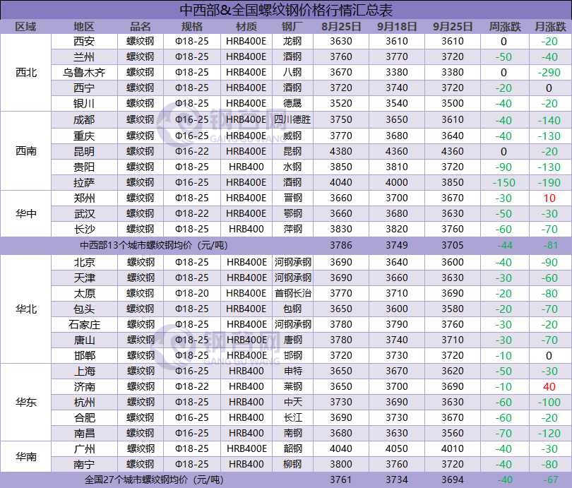 全國建筑鋼材成交價格周/月匯總表(8.25-9.18-9.25)