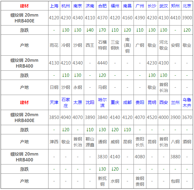 期貨跌幅收窄,商家心態低迷,資源試探性出貨,,盤中現貨報價小幅回落,然需求觀望拿貨為主,成交表現一般,市價維持窄幅震蕩調整,考慮主流倉庫庫存壓力不大,預計明日建材價格或穩中個跌盤整。