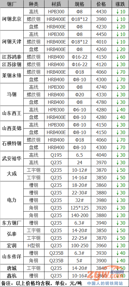 據數據監測,今日共21家鋼廠調價,其中跌幅最大為萊鋼永鋒建材,調價幅度70元/噸,具體調價明細如下:
