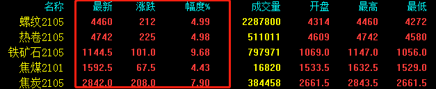 期鋼開盤拉漲,隨后漲停。期螺上漲212收?qǐng)?bào)4460,期卷上漲225收?qǐng)?bào)4742,鐵礦石上漲101收?qǐng)?bào)1144.5,焦煤上漲67.5收?qǐng)?bào)1592.5,焦炭上漲208收?qǐng)?bào)2842。
