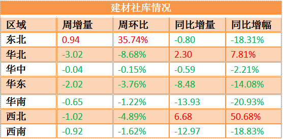建材來看,除東北地區外,其余市場均呈現降庫態勢,但庫存降幅略有放緩。總庫存壓力也在逐步緩解,目前僅華北和西北市場庫存超過去年水平,關注年前需求回落后的累庫壓力。