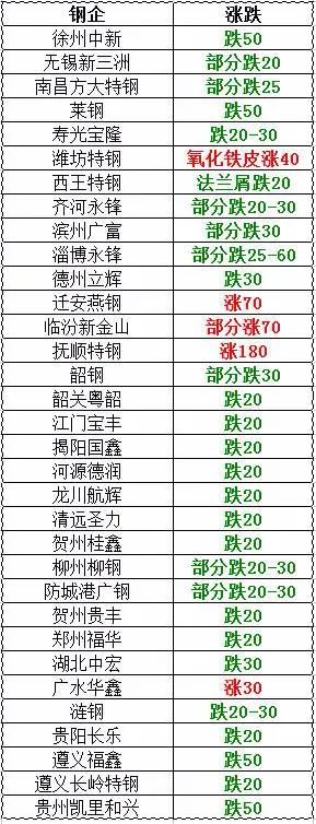 1月16日燕鋼上調70:優質3240,大件剪切3160,重a3200,重b3160,重c3120,中a3140,中b3100,中c3060,小型2795,統料2495,優質鑄鐵3080,普通鑄鐵2880,不含稅。