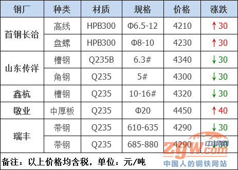據(jù)數(shù)據(jù)監(jiān)測(cè),今日共23家鋼廠調(diào)價(jià),其中漲幅最高為敬業(yè)中厚板,調(diào)價(jià)幅度40元/噸,跌幅最大為鑫杭槽鋼,調(diào)價(jià)幅度30元/噸,具體調(diào)價(jià)明細(xì)如下: 鋼廠調(diào)價(jià) 江蘇雨花建材價(jià)格平穩(wěn) 山西美錦建材價(jià)格平穩(wěn) 山東西王建材價(jià)格平穩(wěn) 河鋼北京建材價(jià)格平穩(wěn) 河鋼天津建材價(jià)格平穩(wěn) 武安裕華高線價(jià)格平穩(wěn) 石橫特鋼建材價(jià)格平穩(wěn) 萊鋼永鋒建材價(jià)格平穩(wěn) 山西高義建材價(jià)格平穩(wěn) 江蘇鴻泰螺紋鋼價(jià)格平穩(wěn) 首鋼長(zhǎng)治建材上調(diào)30元/噸 電力槽鋼價(jià)格平穩(wěn) 大成工字鋼價(jià)格平穩(wěn) 宏潤(rùn)H型鋼價(jià)格平穩(wěn) 弘泰工字鋼價(jià)格平穩(wěn) 唐城工字鋼價(jià)格平穩(wěn) 東方鋼廠槽鋼價(jià)格平穩(wěn) 鑫億源H型鋼價(jià)格平穩(wěn) 鑫杭槽鋼下調(diào)30元/噸 山東傳洋型材下調(diào)30元/噸 瑞豐帶鋼下調(diào)30元/噸 敬業(yè)中厚板上調(diào)40元/噸 普陽(yáng)中厚板價(jià)格平穩(wěn) 鋼廠調(diào)價(jià)占比 上調(diào)2家,占比8.7%,調(diào)價(jià)幅度30-40元/噸。 下調(diào)3家,占比13.1%,調(diào)價(jià)幅度30元/噸。 平穩(wěn)18家,占比78.2%。 鋼廠檢修信息 一、廣漢德盛鋼鐵2021年1月停產(chǎn)信息 廣漢德盛鋼鐵計(jì)劃于2021年1月29日停產(chǎn)放假,復(fù)產(chǎn)時(shí)間待定,預(yù)計(jì)影響螺紋鋼產(chǎn)量2800噸/天。 二、四川綿竹金泉鋼鐵2021年1月停產(chǎn)信息 綿竹金泉鋼鐵1月31日至2月16日停產(chǎn)放假,預(yù)計(jì)影響建筑鋼材產(chǎn)量5.1萬(wàn)噸。 重要行業(yè)信息 一、山鋼集團(tuán)并入寶武集團(tuán)已進(jìn)入實(shí)質(zhì)性推進(jìn)階段 山東鋼鐵集團(tuán)并入寶武集團(tuán)已進(jìn)入實(shí)質(zhì)性推進(jìn)階段,預(yù)計(jì)在春節(jié)后或有正式消息落地。山鋼的加入,一方面將為寶武集團(tuán)在北方的產(chǎn)能擴(kuò)張打下堅(jiān)實(shí)基礎(chǔ);另一方面山鋼旗下永鋒鋼鐵等參股產(chǎn)能的加入,也將對(duì)寶武集團(tuán)豐富產(chǎn)品結(jié)構(gòu),推進(jìn)企業(yè)混改起到關(guān)鍵性作用。 二、商務(wù)部:推動(dòng)汽車(chē)等消費(fèi)品由購(gòu)買(mǎi)管理向使用管理轉(zhuǎn)變 商務(wù)部召開(kāi)2020年商務(wù)工作及運(yùn)行情況新聞發(fā)布會(huì),會(huì)上表示,今年將促進(jìn)商品消費(fèi),推動(dòng)汽車(chē)等消費(fèi)品由購(gòu)買(mǎi)管理向使用管理轉(zhuǎn)變,深化汽車(chē)流通放管服改革,鼓勵(lì)開(kāi)展汽車(chē)下鄉(xiāng)和汽車(chē)、家電、家具以舊換新。 三、FMG四季度鐵礦石產(chǎn)量同環(huán)比均降4% 澳大利亞礦業(yè)公司FMG發(fā)布2020年第四季度(2021澳大利亞財(cái)年Q2)運(yùn)營(yíng)報(bào)告,報(bào)告顯示:四季度FMG鐵礦石加工量達(dá)4420萬(wàn)噸,環(huán)比下降4%,同比下降4%。