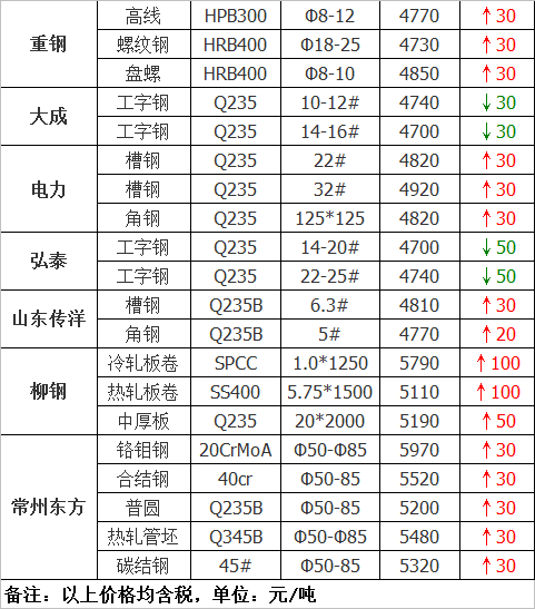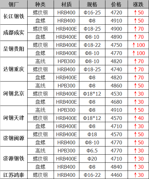 據數據監測,今日共35家鋼廠調價,其中漲幅最高為呈鋼貴陽建材,調價幅度100元/噸,跌幅最大為弘泰工字鋼,調價幅度50元/噸,具體調價明細如下: