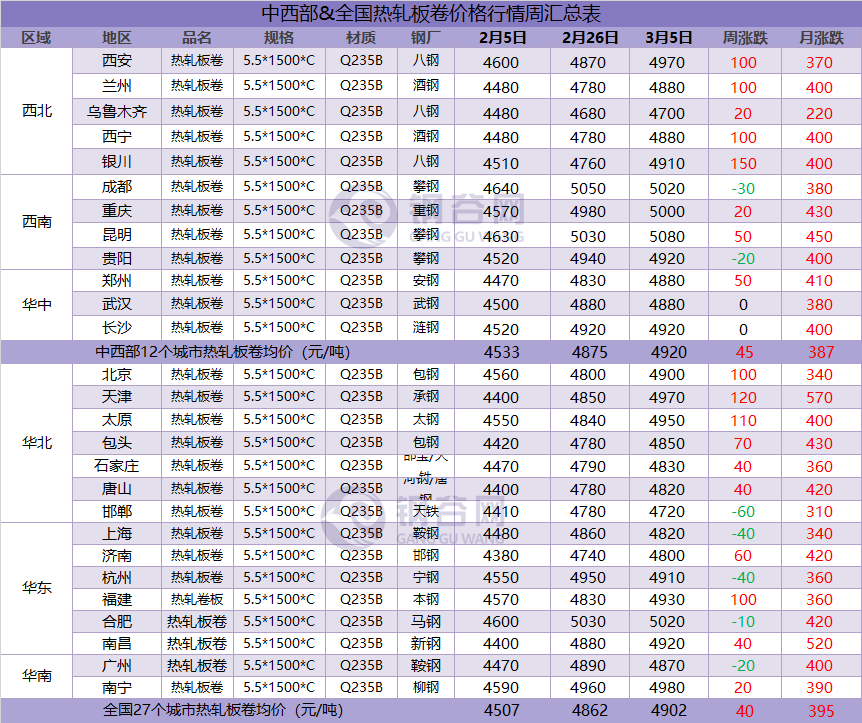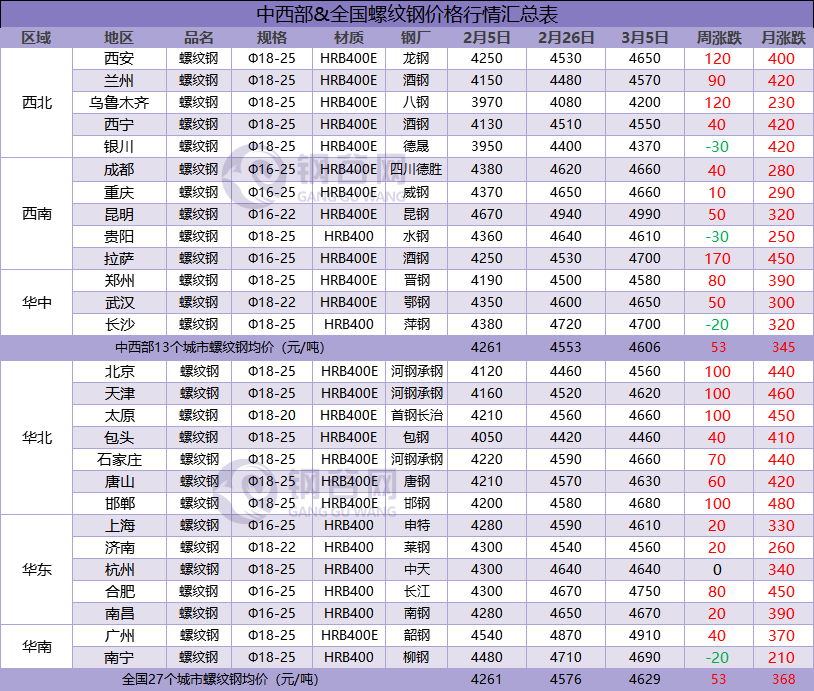 據(jù)鋼谷網(wǎng)數(shù)據(jù)監(jiān)測,本周全國主要城市鋼材市場價格整體上漲,漲幅10-230元/噸。截止3月5日,全國27個城市螺紋鋼均價4629元/噸,較上周漲53元/噸;全國27個城市高線均價4751元/噸,較上期漲57元/噸;全國27個城市盤螺均價4803元/噸,較上期漲63元/噸;全國27個城市熱軋板卷均價4902元/噸,較上周漲40元/噸;全國27個城市中厚板均價4902元/噸,較上期漲72元/噸。