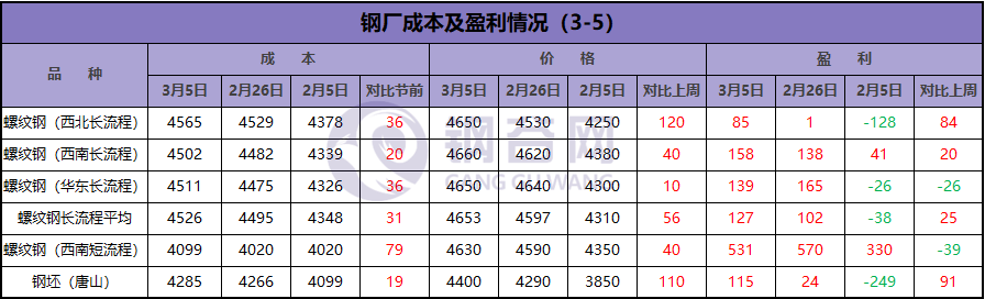 本周螺紋鋼成本小漲,價格大漲,利潤較上周擴大。本周鐵礦石價格小漲,焦炭持穩(wěn)回調(diào),廢鋼上漲,整體上長流程螺紋鋼成本較上周大幅抬升31元/噸;螺紋鋼價格大幅上漲,總體上鋼廠平均利潤上升25元/噸。西南地區(qū)短流程鋼廠螺紋鋼成本上漲,價格小漲,利潤于上周小幅回落。唐山鋼坯鋼廠生產(chǎn)成本抬升19元/噸,鋼坯利潤較上周大幅上升91元/噸。