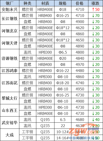 據(jù)數(shù)據(jù)監(jiān)測,今日共31家鋼廠調(diào)價,其中漲幅最高為安陽永興建材,調(diào)價幅度50元/噸,跌幅最大為瑞豐帶鋼,調(diào)價幅度70元/噸,具體調(diào)價明細(xì)如下: 鋼廠調(diào)價 沙鋼3月中旬建材平穩(wěn) 山西宏達(dá)建材價格平穩(wěn) 山西高義建材價格平穩(wěn) 安陽永興建材價格上調(diào)50元/噸 黎城太行建材下調(diào)30元/噸 江蘇雨花建材下調(diào)70元/噸 山東西王建材下調(diào)20元/噸 濟(jì)源鋼鐵建材下調(diào)20元/噸 江蘇鴻泰螺紋鋼下調(diào)50元/噸 武安裕華高線下調(diào)20-40元/噸 河鋼北京建材價格下調(diào)20元/噸 河鋼天津建材價格下調(diào)30元/噸 長江鋼鐵建材價格下調(diào)70元/噸 電力型材價格平穩(wěn) 唐城工字鋼下調(diào)50元/噸 大成工字鋼下調(diào)50元/噸 宏潤H型鋼下調(diào)50元/噸 東方鋼廠槽鋼下調(diào)50元/噸 山東傳洋型材下調(diào)20元/噸 鑫億源H型鋼下調(diào)50元/噸 天鋼板材下調(diào)20元/噸 敬業(yè)中厚板下調(diào)50元/噸 普陽中厚板下調(diào)40元/噸 瑞豐帶鋼價格下調(diào)70元/噸 冀鋼中厚板價格下調(diào)30元/噸 友發(fā)鍍鋅管價格下調(diào)30元/噸 沙鋼永興碳結(jié)鋼上調(diào)50元/噸 湘鋼優(yōu)鋼價格上調(diào)50元/噸 中天鋼鐵優(yōu)鋼上調(diào)50元/噸 淮鋼優(yōu)鋼上調(diào)50元/噸 沙鋼工業(yè)線材價格平穩(wěn) 鋼廠調(diào)價占比 上調(diào)5家,占比16.1%,調(diào)價幅度50元/噸。 下調(diào)21家,占比67.8%,調(diào)價幅度20-70元/噸。 平穩(wěn)5家,占比16.1%。 鋼廠檢修信息 福建凱景彩涂線檢修信息 據(jù)了解,福建凱景彩涂生產(chǎn)線近日進(jìn)行檢修,于3月9日開始檢修,預(yù)計3月20日開機(jī),預(yù)計影響彩涂供應(yīng)0.45萬噸。 重要行業(yè)信息 1、商務(wù)部:上周鋼材價格小幅上漲 煤炭價格小幅下降 據(jù)商務(wù)部監(jiān)測,上周(3月1日至7日)全國鋼材價格小幅上漲,其中普通中板、熱軋帶鋼、高速線材、螺紋鋼價格分別為每噸4834元、4675元、4671元和4557元,分別上漲1.7%、1.7%、1.6%和1.5%。煤炭價格小幅下降,其中動力煤、二號無煙塊煤、煉焦煤價格分別為每噸612元、950元和777元,分別下降1.3%、0.7%和0.1%。 2、敬業(yè)集團(tuán)收購英鋼一周年 英鋼扭虧為盈 3月9日,敬業(yè)集團(tuán)在本部和英鋼舉行了收購英鋼一周年暨敬業(yè)英鋼盈利慶祝大會。英鋼2月份扭虧為盈!這成為敬業(yè)英鋼的重要?dú)v史轉(zhuǎn)折點(diǎn),也給敬業(yè)集團(tuán)收購英鋼一周年送上一份兒大禮!在疫情帶來的全球經(jīng)濟(jì)持續(xù)低迷下,敬業(yè)集團(tuán)引領(lǐng)英鋼逆勢而上、起死回生,創(chuàng)造了令人驚訝的奇跡,不僅證明了中國鋼鐵業(yè)的實力,也給了海內(nèi)外各界關(guān)心人士一個肯定的回答。 3、鐵路建設(shè)支撐歐洲鋼軌需求 根據(jù)歐盟統(tǒng)計局的數(shù)據(jù),截至2018年,歐洲有超過21.5萬千米的鐵路網(wǎng)。歐洲鐵路行業(yè)協(xié)會報告稱,歐洲鋼軌供應(yīng)業(yè)滿足了歐盟鐵路供應(yīng)和服務(wù)市場的84%,歐盟鋼軌供應(yīng)商的絕對銷售額為470億歐元(約580億美元)。歐盟是鋼軌凈出口地區(qū),每年進(jìn)口的鋼軌數(shù)量適中。根據(jù)相關(guān)數(shù)據(jù),2019年,歐盟進(jìn)口鋼軌僅1.7萬余噸,相比之下,歐盟向全球其他地區(qū)供應(yīng)的鋼軌為42.3萬噸。