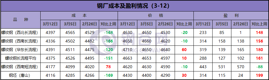 本周螺紋鋼成本下降,價(jià)格小幅波動(dòng),利潤(rùn)較上周擴(kuò)大。本周鐵礦石價(jià)格小漲,焦炭持穩(wěn)回調(diào),廢鋼小幅調(diào)整,整體長(zhǎng)流程螺紋鋼成本較上周大幅下降。