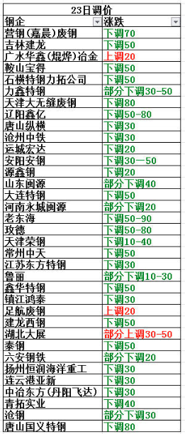 3月23日唐山縱橫下調30:模具鋼3260,法蘭片3260,大轉子弓子板3200,優質一級3260,重a3180,優質鑄鐵2980,鋼板滾剪料3280,鋼板料一級3260,鋼筋切粒3260,干磨鐵2970,矽鋼片小料2970,鋼筋壓塊3090,特級破碎料3120,不含稅 。