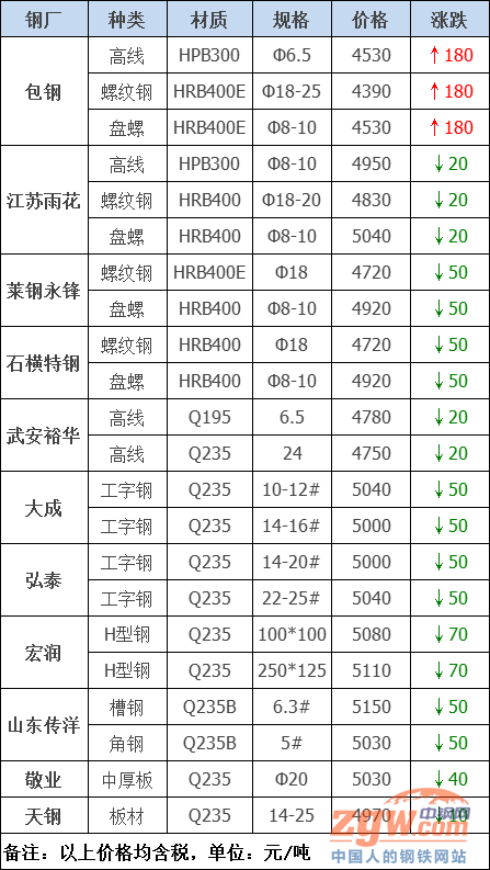 數據監測,今日共21家鋼廠調價,其中漲幅最高為包鋼建材,調價幅度180元/噸,跌幅最大為宏潤H型鋼,調價幅度70元/噸,具體調價明細如下: