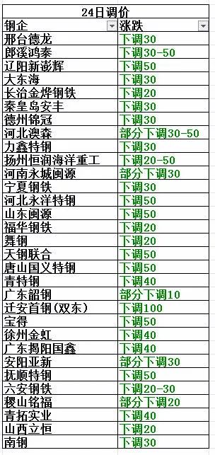 24日唐山廢鋼調價:重廢3070-3100,一級破碎料3120-3150,鋼坯頭3330-3360,鋼板料3270-3330,鋼筋切頭3390-3430,馬蹄鐵3210-3220,模具鋼3290-3360,不含稅。
