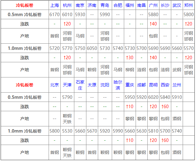 今冷軋市場穩中上漲,今期貨高位震蕩,現貨市場價格平穩,下游心態尚可,市場成交量較穩,預計冷軋板卷價格仍將高位運行。