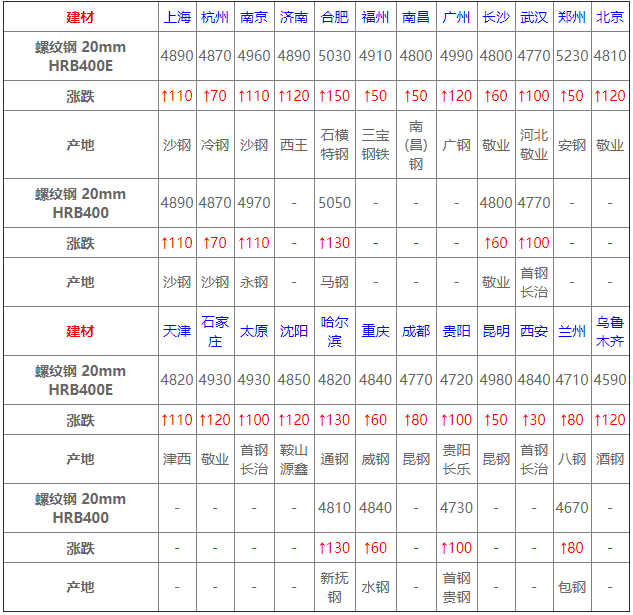 今建材價格整體上漲。整體來看,今市場價格較上周五下午普遍出現100元/噸的漲幅。據了解,當前部分商家恐高心理明顯,操作仍以出貨為主,交易價格較為靈活。另外,也有工地周末受漲價影響,提前大量備貨,預計短期內建材價格繼續上漲。