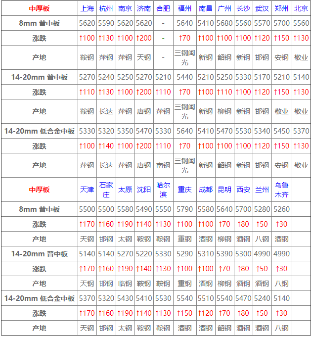 今全國中板大幅拉漲,幅度40-200元/噸,受期貨市場盤面上行影響,商家積極跟漲價格,高價位成交乏力,下游持謹慎觀望心態;預計明日仍將繼續上漲。