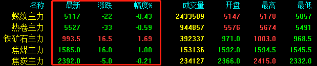 期鋼沖高回落,期螺下跌22收報5117,期卷下跌33收報5527,鐵礦石上漲16.5收報993.5,焦煤下跌16收報1585,焦炭下跌5收報2392。