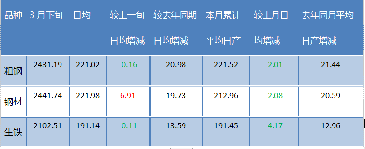 中鋼協最新數據顯示,3月下旬重點鋼企生鐵和粗鋼日均產量均呈現環比下降。其中,粗鋼日均產量221.02萬噸,環比下降0.16%,生鐵日均191.4萬噸,環比下降0.11%。鋼材產量日均221.98萬噸,環比增長6.91%。3月作為需求旺季,通常是增產的季節,但從目前鋼產量情況來看,環保限產加壓,增產空間縮減,對鋼價形成支撐。