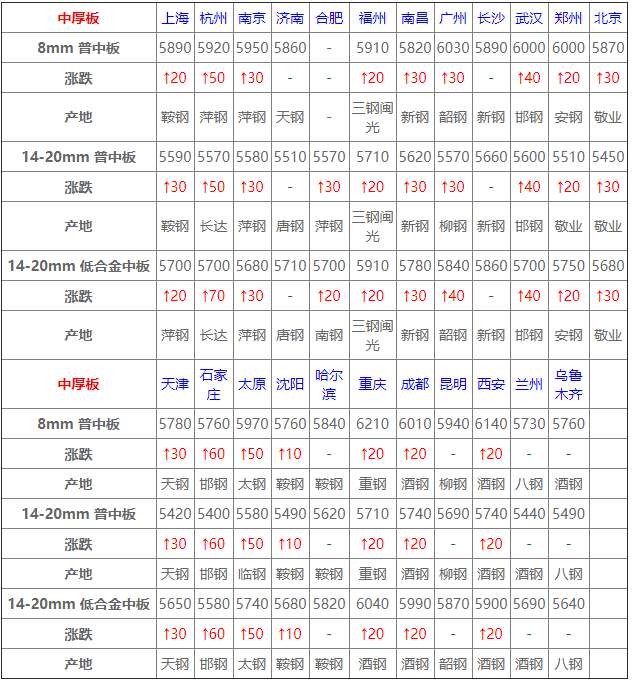 今全國中板市場偏強為主,幅度20-50元,市場行情再度拉漲,現貨緊跟調整,整體成交情況表現一般,下游剛需采買。