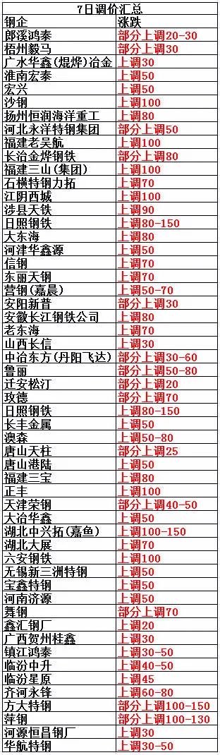 鋼廠:各地大中型鋼廠出廠價格全面上漲,在沙鋼上旬價格上調350-450、永鋼上調400-450、中天上調250-350的助推下,節日期間多家鋼廠累計上調逾百元/噸。6日各地鋼廠繼續推漲,呈鋼貴陽上調300-370元,水鋼貴陽上調300元,方大特鋼上調240-270元,韶鋼上調200元,福建三鋼上調150元,廣西桂鑫上調130-170元。另外,唐山國鑫槽鋼上調240元,柳鋼冷軋卷上調100元。