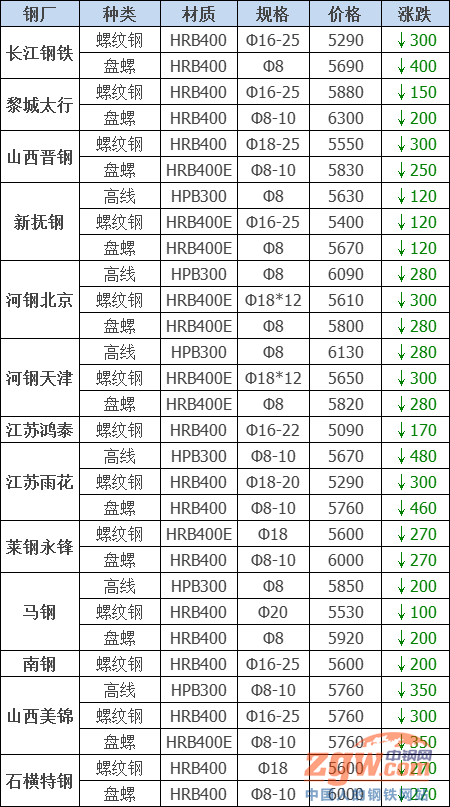 據數據監測,今日共28家鋼廠調價,其中跌幅最大為江蘇雨花線材,調價幅度480元/噸,具體調價明細如下: 鋼廠調價 南鋼螺紋鋼下調200元/噸 新撫鋼建材下調120元/噸 馬鋼建材下調100-200元/噸 萊鋼永鋒建材下調270元/噸 武安裕華高線下調200元/噸 石橫特鋼建材下調270元/噸 首鋼長治建材下調400元/噸 福海鑫螺紋鋼下調100元/噸 江蘇鴻泰螺紋鋼下調170元/噸 唐山玄龍螺紋鋼下調100元/噸 江蘇鴻泰螺紋鋼下調170元/噸 唐山玄龍螺紋鋼下調100元/噸 江蘇雨花建材下調300-480元/噸 山西美錦建材下調300-350元/噸 長江鋼鐵建材下調300-400元/噸 河鋼天津建材下調280-300元/噸 河鋼北京建材下調280-300元/噸 山西晉鋼建材下調250-300元/噸 黎城太行建材下調150-200元/噸 電力型材下調170元/噸 弘泰工字鋼下調250元/噸 大成工字鋼下調220元/噸 唐城工字鋼下調250元/噸 宏潤H型鋼下調100元/噸 山東傳洋型材下調200元/噸 鑫億源H型鋼下調100元/噸 瑞豐帶鋼下調400元/噸 常州東方優鋼下調300元/噸 鋼廠調價占比 下調28家,占比100%,調價幅度100-480元/噸。 行情簡評 今日鋼廠價格跌勢加深,期鋼持綠震蕩,低位有所上移。原料方面,普指跌8.3,鐵礦商家心態不佳。廢鋼保持觀望,鋼廠采購量一般。唐山近期有減排措施,部分鋼廠停產,焦煤穩中偏強。市場方面,悲觀氛圍蔓延,商家觀望為主,操作謹慎,但帶鋼跌后部分資源成交尚可,價格有企穩跡象。預計短期鋼廠價格穩中偏弱。