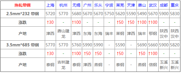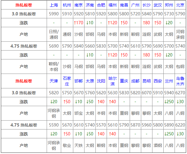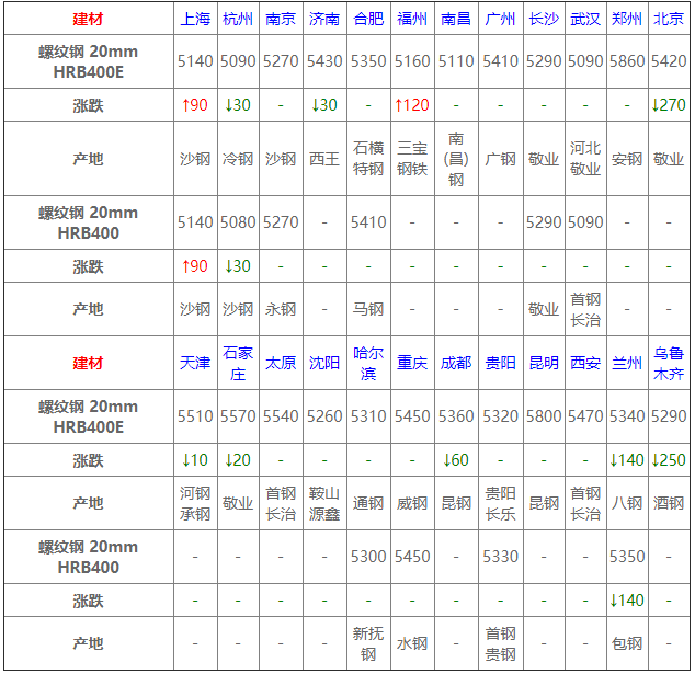 5月21日鋼鐵價(jià)格漲跌圖 5月21日建材價(jià)格:窄幅調(diào)整; 今建材價(jià)格主流下調(diào),市場(chǎng)高位幾無(wú)成交,商戶堅(jiān)挺觀望出貨,下游謹(jǐn)慎剛需為主。考慮觀望心態(tài)明顯,預(yù)計(jì)短期建材價(jià)格窄幅調(diào)整。 2 5月21日熱軋板卷價(jià)格:漲跌互現(xiàn); 今日熱軋市場(chǎng)價(jià)格穩(wěn)中震蕩,幅度在50-100,市場(chǎng)商家根據(jù)自身出貨情況調(diào)整,下游市場(chǎng)對(duì)目前的價(jià)格多持觀望心態(tài),市場(chǎng)成交平平;