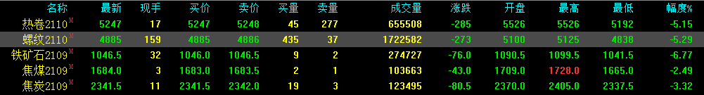 本周美股收盤漲跌不一,市場對經濟復蘇和通脹上漲的態度暫無定論,以及對于美聯儲接下來貨幣政策的行動都處于猜測和盡量規避風險的狀態,周五夜盤期鋼主要受外盤影響,期螺繼續下跌273收報4885,期卷下跌285收報5247,鐵礦石下跌76收報1046.5,焦煤下跌43收報1684,焦炭下跌80.5收報2341.5。