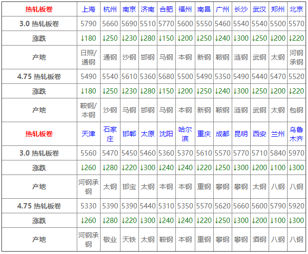 今全國熱卷市價寬幅下行,幅度50-350,期卷走勢欠佳,成本支撐疲軟,商戶心態(tài)較弱,多以出貨為主,一單一議,整體交投氛圍顯清冷;