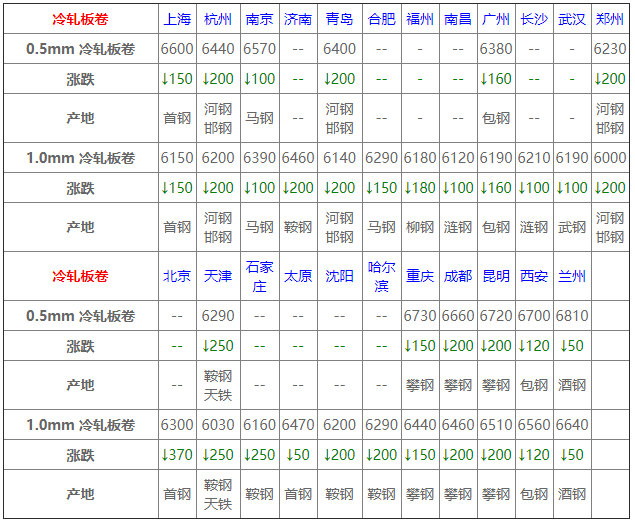 今全國冷軋下跌為主,幅度50-200,市場行情波動較大,各地商家多恐慌性拋售,報價不一,多以出貨為主,然終端多以剛需拿貨,謹慎操作,整體交投氛圍平淡;