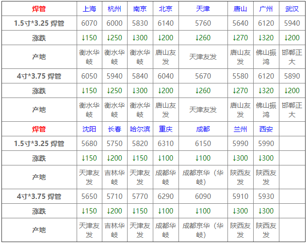 今日開市,230日唐山市場焊管價格窄幅上調,成交尚可。據富寶鋼鐵網管材研究中心市場監(jiān)測顯示:成都市場1.5*3.25成都京華焊管價格為5740元/噸,4*3.75成都京華焊管價格為5730元/噸,6*4成都京華焊管價格為5780元/噸。