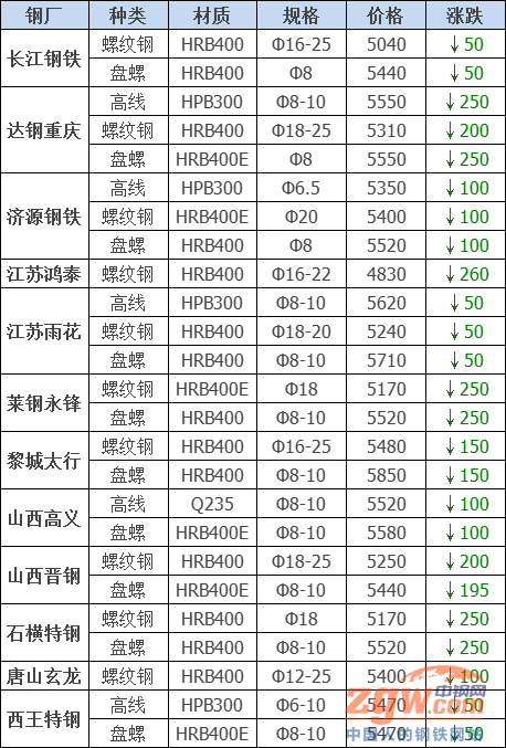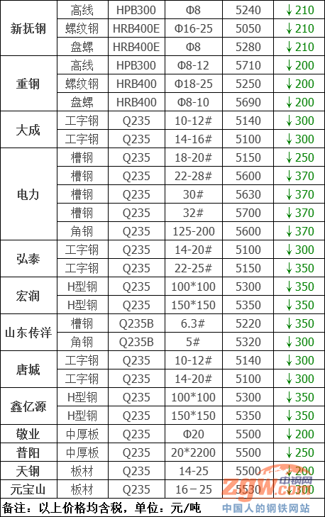 據不完全統計,今日共30家鋼廠調價,跌幅最大為電力型材,調價幅度370元/噸具體調價明細如下: