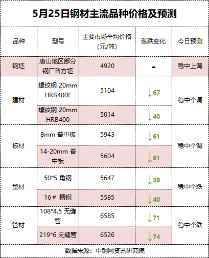 25日,期卷期螺小幅下跌,期螺繼續在五千以下徘徊,鐵礦石拉漲后收跌,焦煤焦炭小幅上漲,短期內將進入調整階段?,F貨市場,隨著期鋼稍有反彈,各主流品種跌幅明顯收窄,個別地區報價翻紅,市場觀望情緒有所減緩,投機行為明顯減少,貿易商出貨情緒較高,但成交還是以低價為主,預計今日鋼價穩中個調。